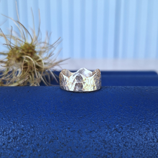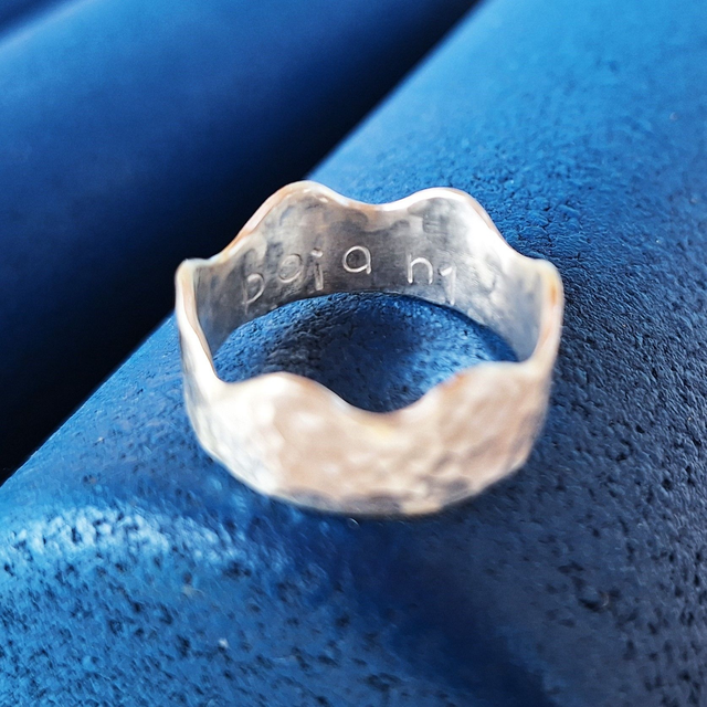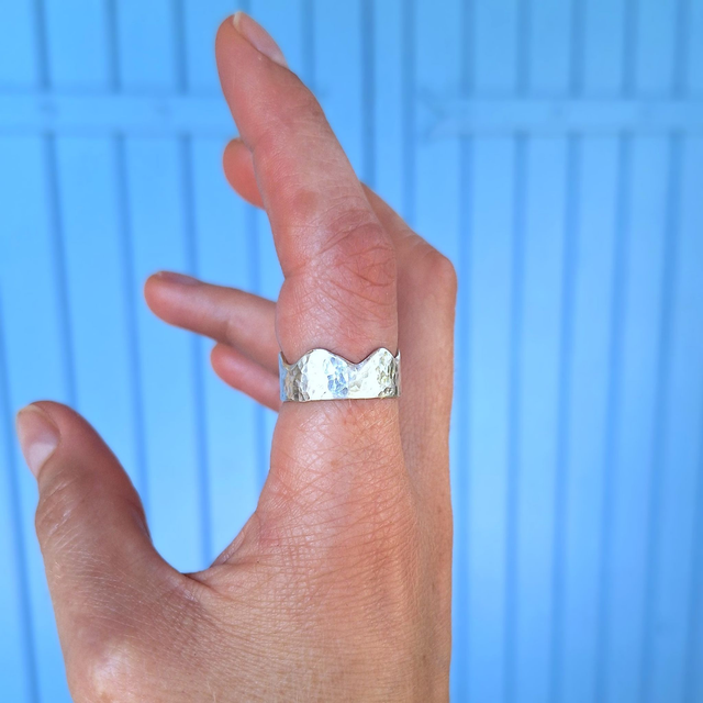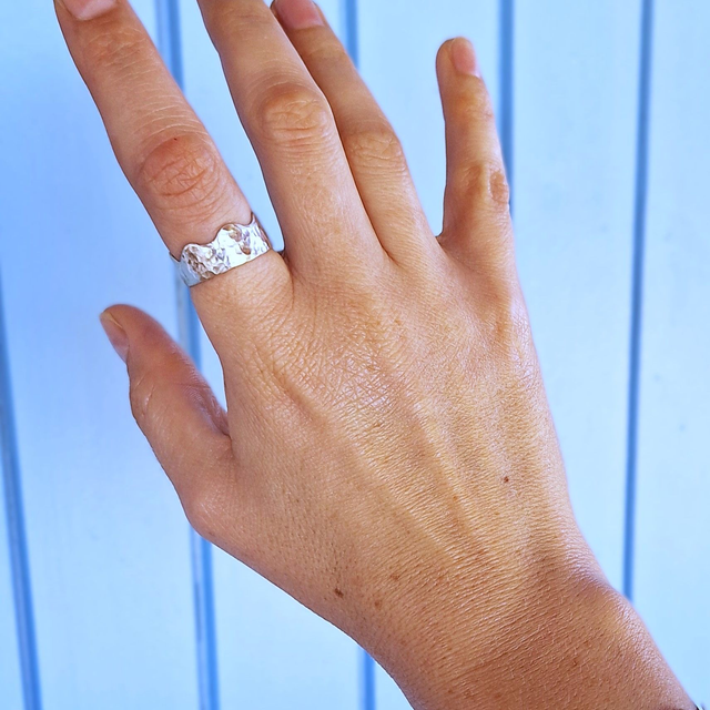 La bague Vague en argent 925 martelé, une finition qui reflète les mouvements de la mer. Chaque bague est unique, façonnée à la main et numérotée.