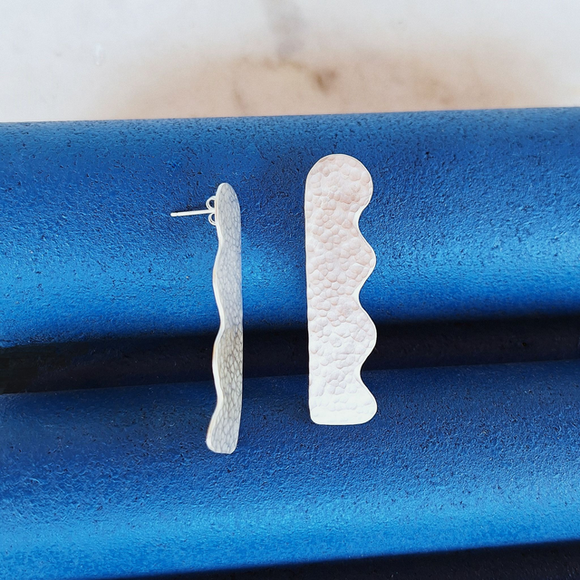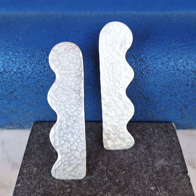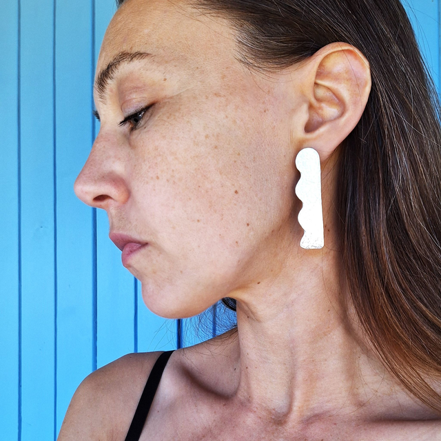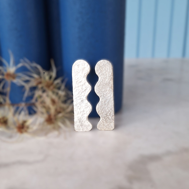 Les boucles d'oreilles La Vague en argent 925 martelé, une finition qui reflète les mouvements de la mer. Ce bijou est unique, chaque paire de boucles est fait main en France et numéroté. Clous d'oreilles avec un fermoir poussoir papillon, tout en argent 925.
