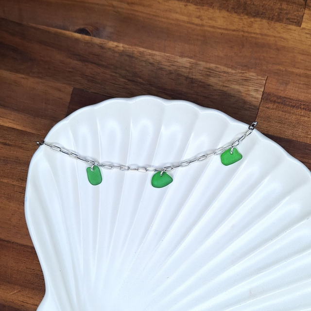Le bracelet Bocca est une chaîne en argent recyclé avec 3 breloques en verre marin dépoli des plages de la Côte d'Azur. Chaque pièce de verre est unique, elles ont été polies par la mer et trouvées sur la plage ce qui donne différentes formes et nuances. Le bijoux sur la photo est celui qui sera envoyé.